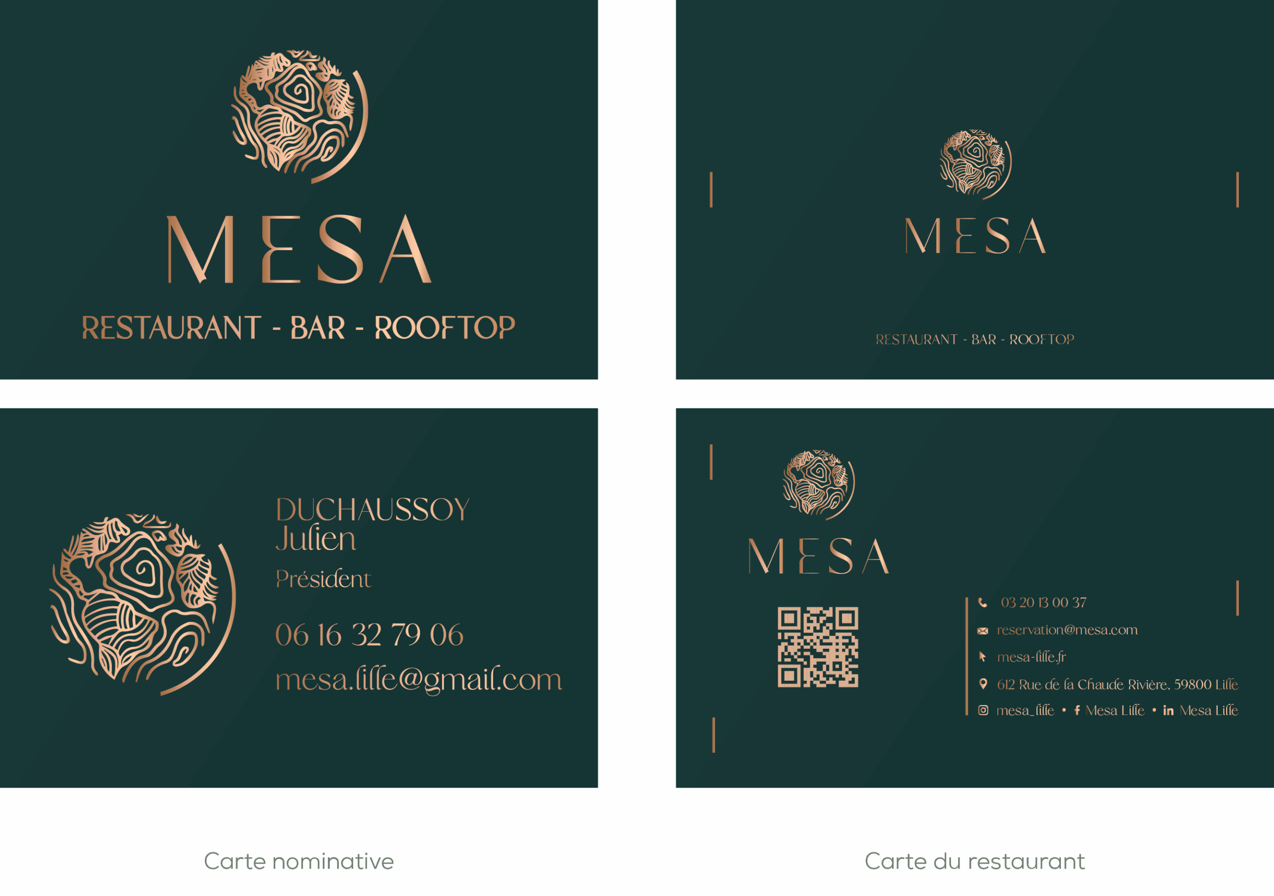 J’ai accompagné MESA pendant plus d’un an, à chaque étape de sa création. De l’émergence du concept à l’ouverture du restaurant, j’ai conçu une identité visuelle complète, en développant la papeterie, les supports imprimés et la carte d’ouverture dans un esprit de cohérence et de sens.
