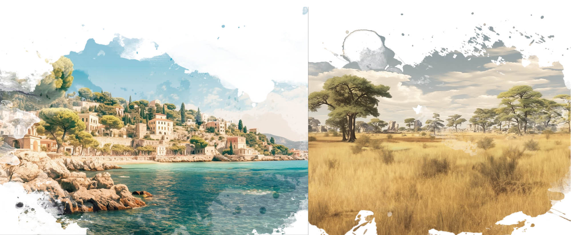 Pour accompagner la cuisine du monde de MESA, chaque continent, chaque escale culinaire est représentée à travers des illustrations à l’aquarelle. Inspirées des carnets de route d’explorateurs modernes, elles évoquent la Méditerranée, l’Asie, l’Afrique ou l’Amérique du Sud avec douceur et poésie. Une immersion visuelle, comme une invitation à voyager… avant même la première bouchée.