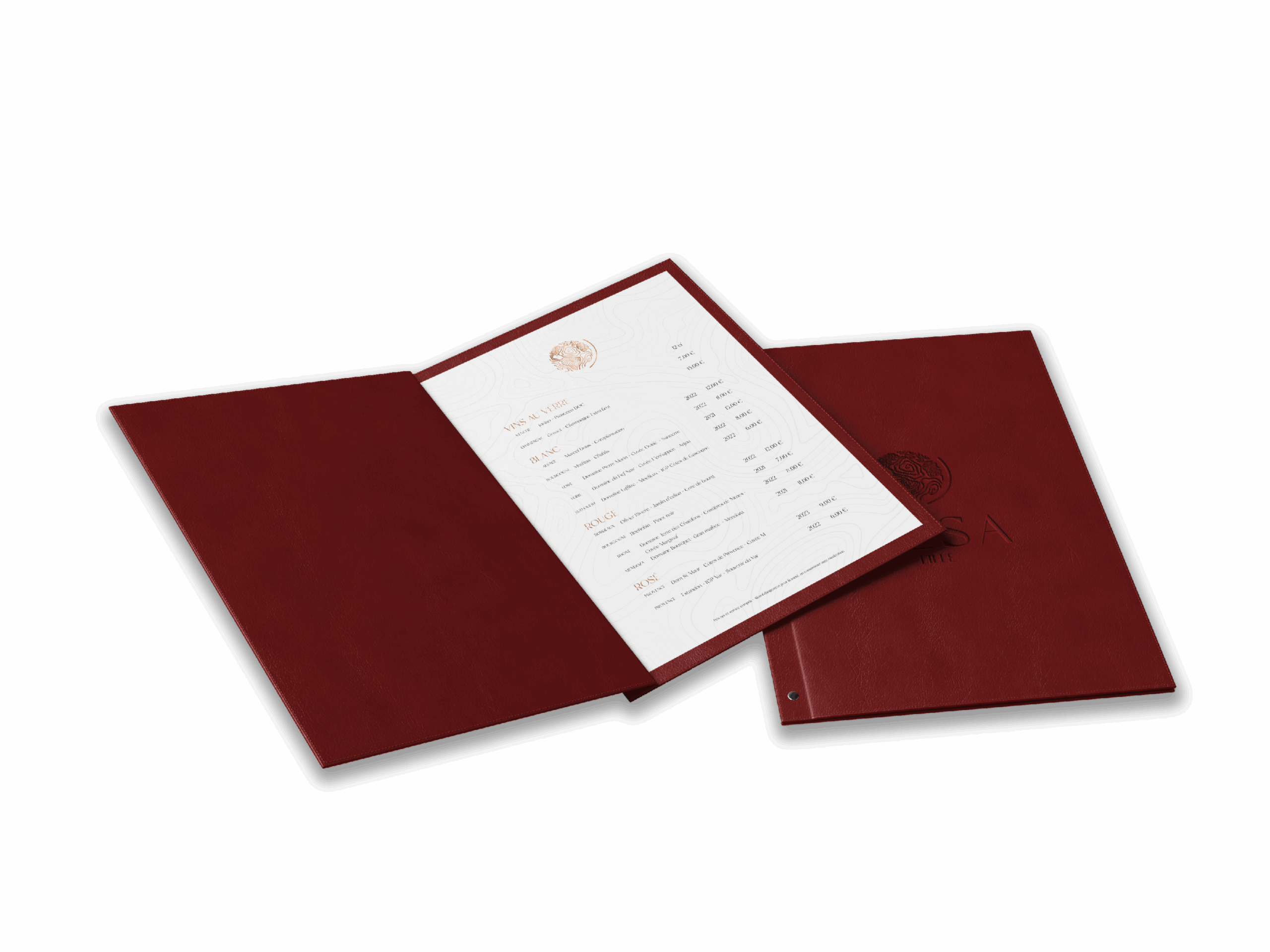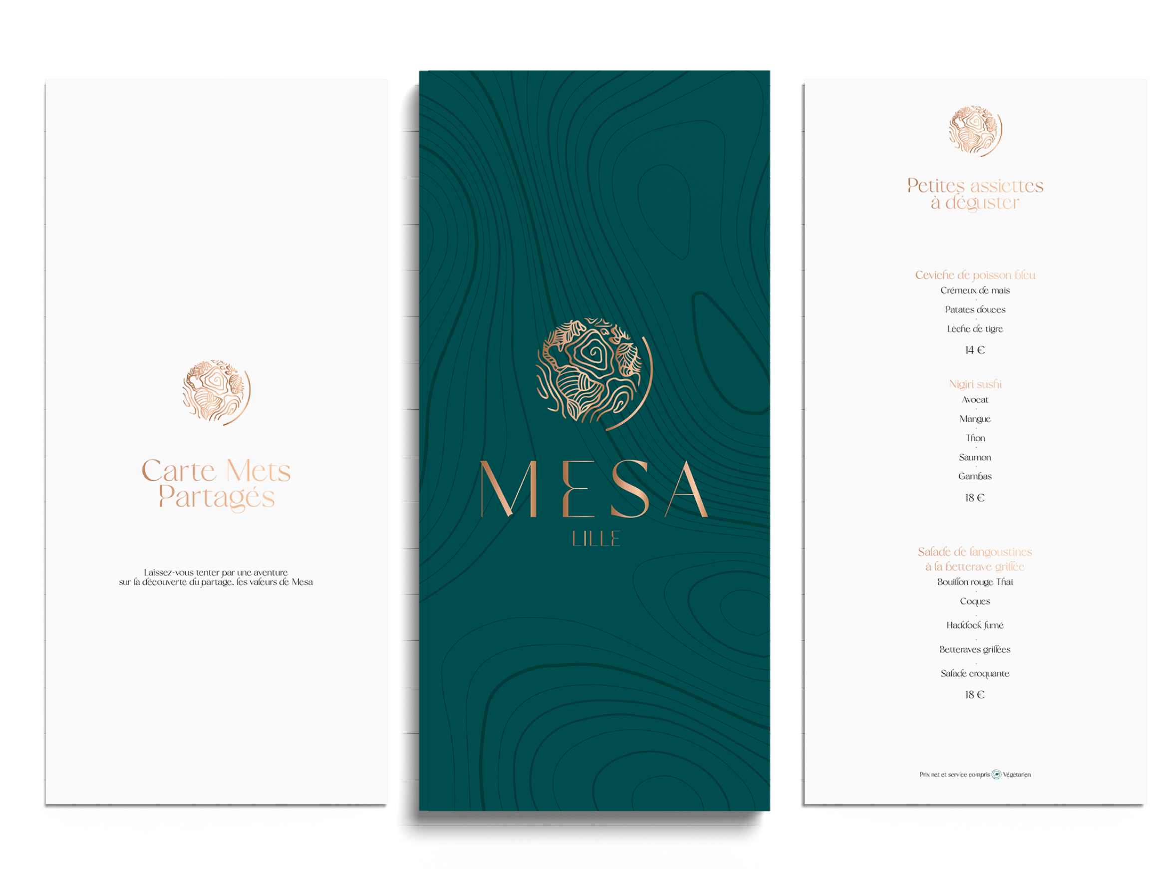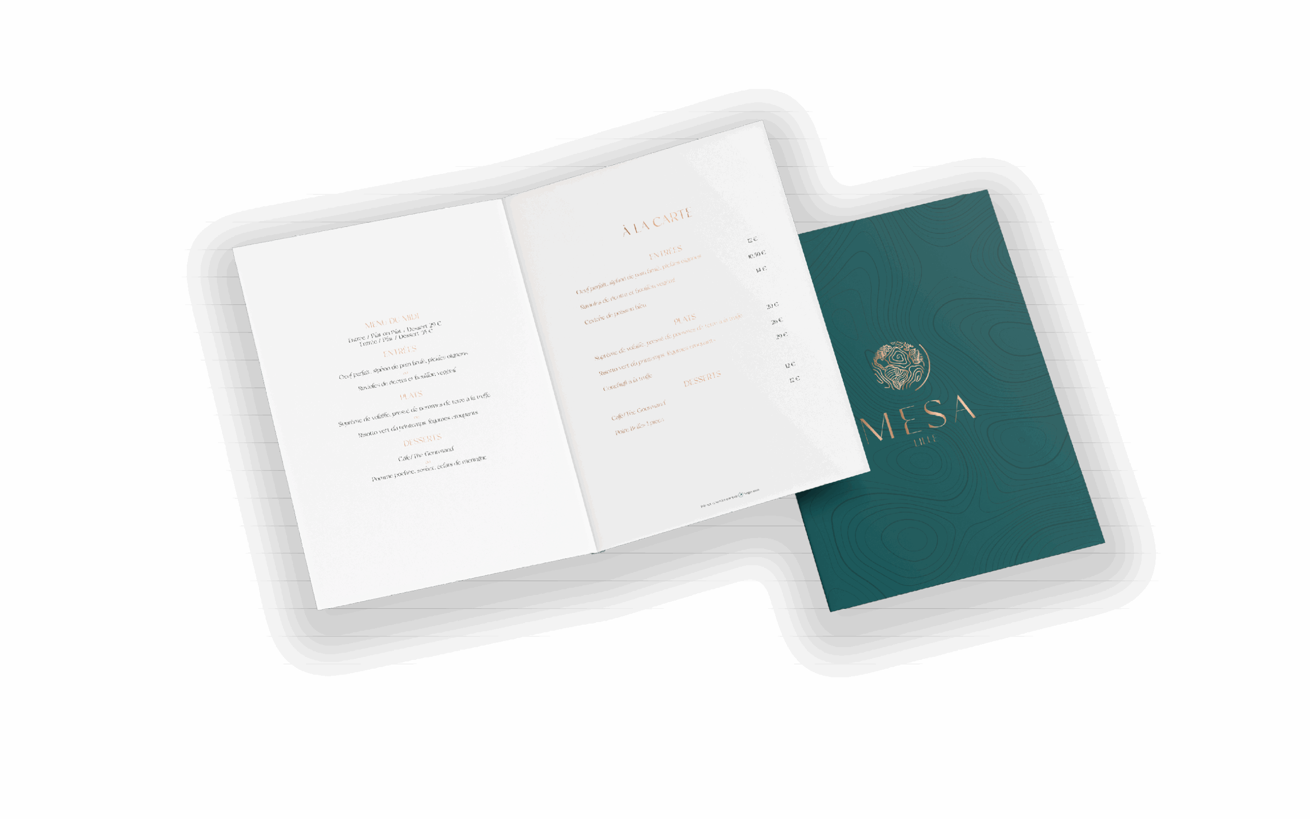À midi, une carte claire et structurée pensée pour les actifs, à l’image du pôle business. Le soir, une mise en page aérée et chaleureuse accompagne l’esprit de partage. Le graphisme élégant, inspiré des topographies du monde, reflète l’univers de MESA : raffiné, voyageur et généreusement tourné vers l’autre.