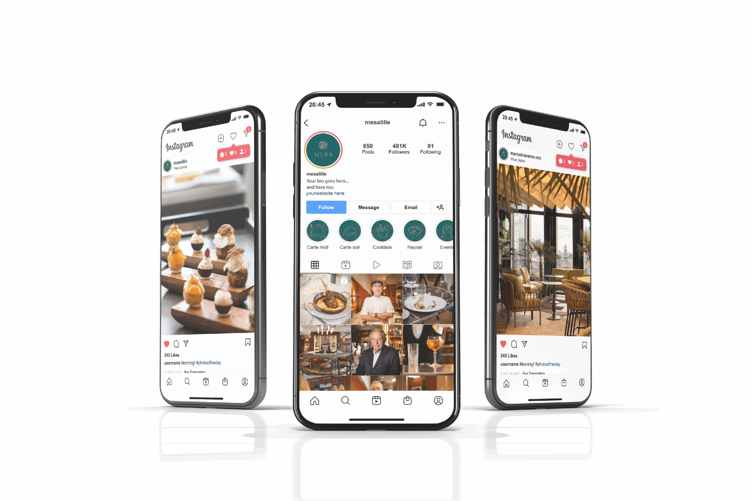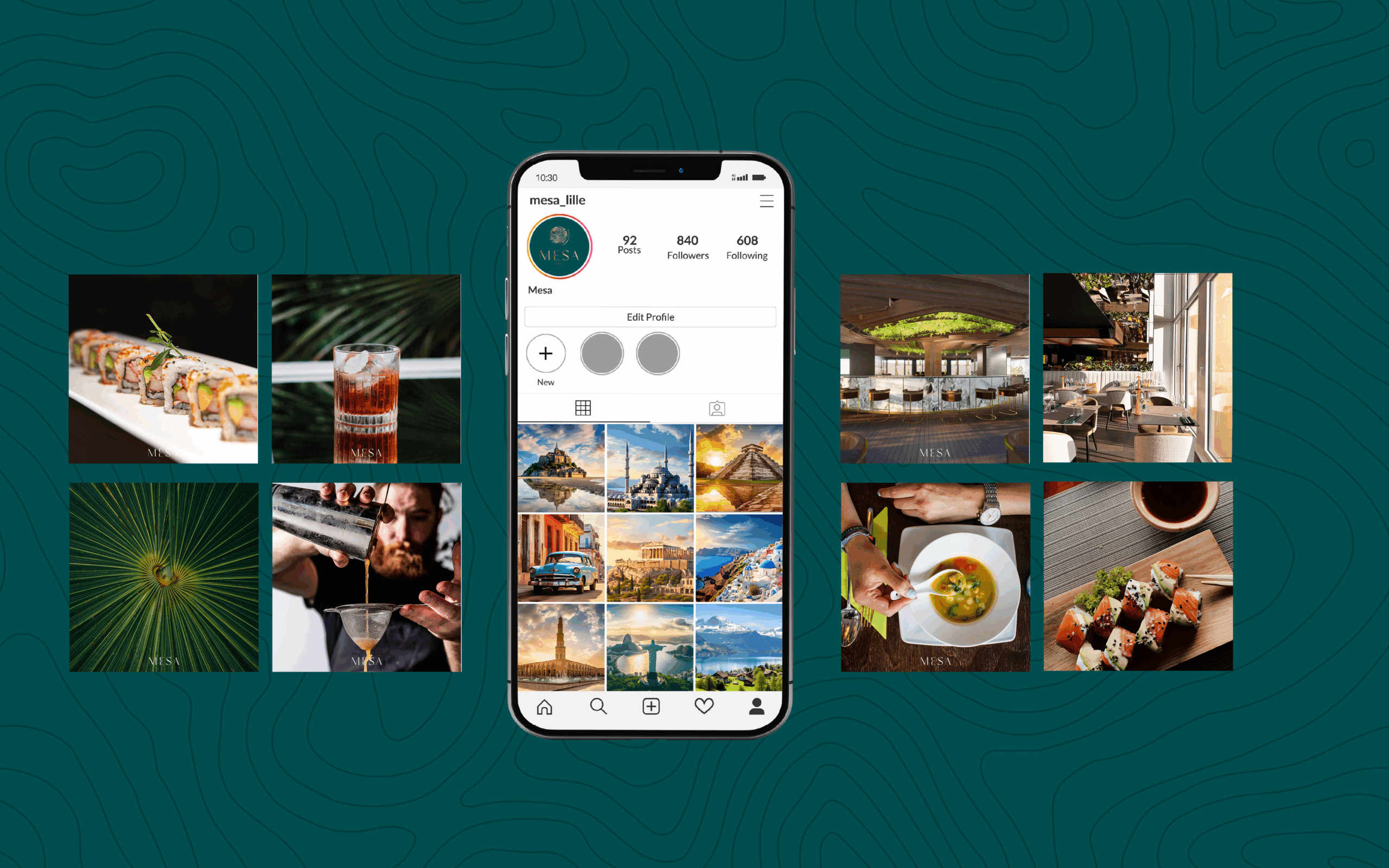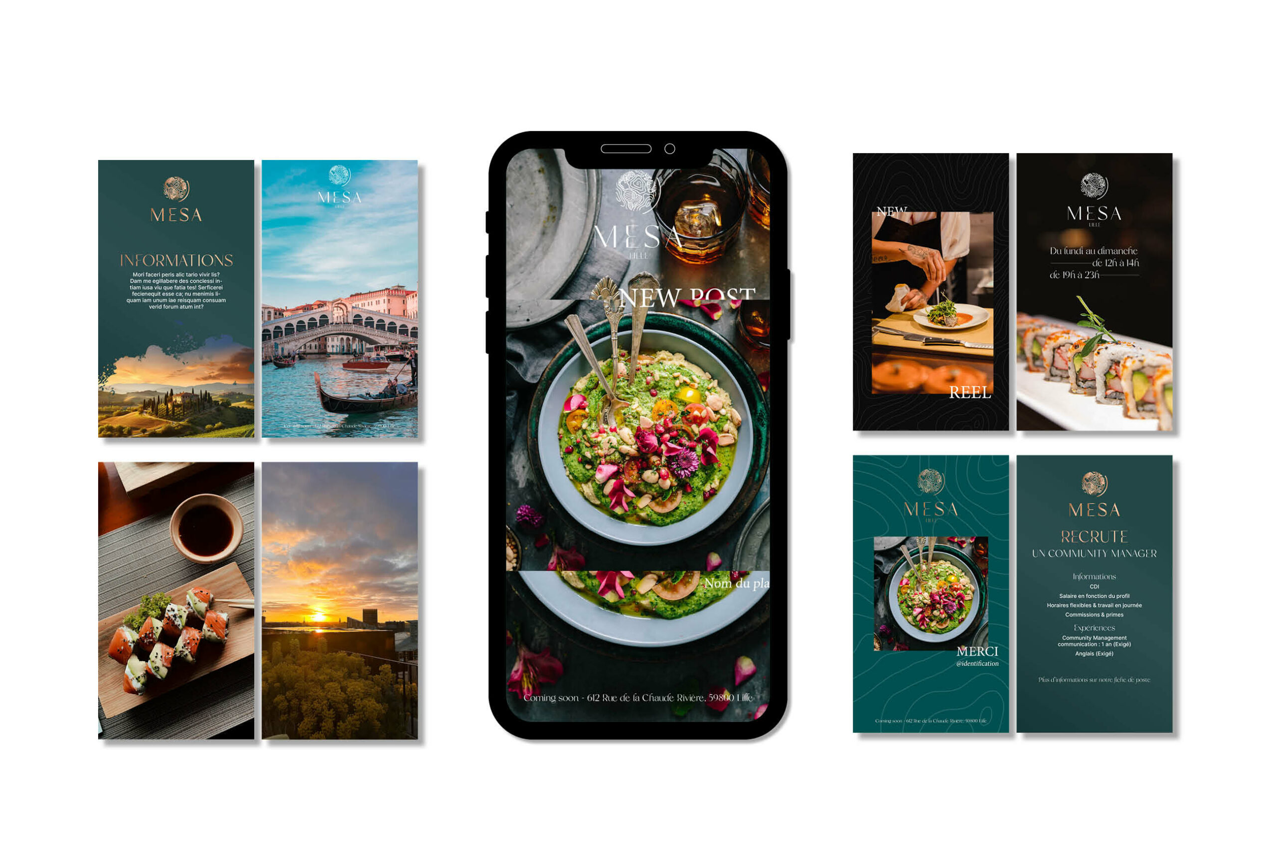 Pensée comme une extension visuelle du restaurant, la direction artistique du compte de MESA mêle élégance contemporaine et invitation au voyage. Palette profonde, typographies soignées, motifs topographiques et jeux de mise en page créent une harmonie graphique forte. Chaque publication reflète l’univers de la marque, entre exploration culturelle, raffinement visuel et sens du détail.