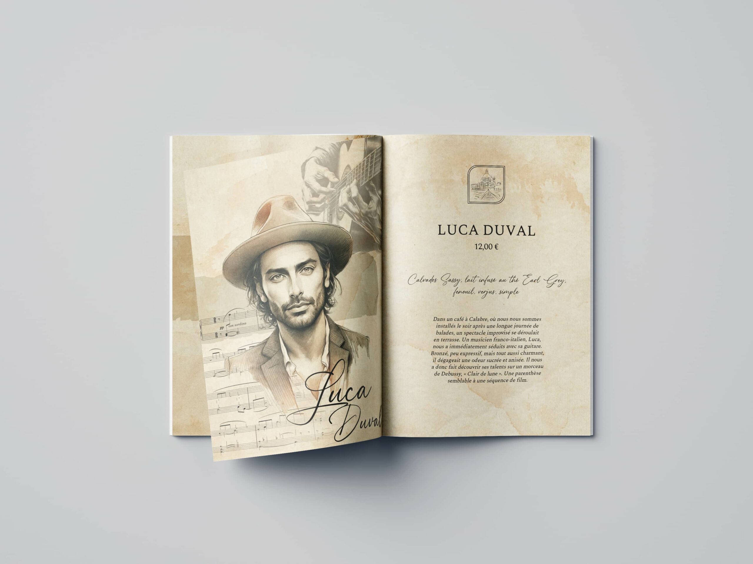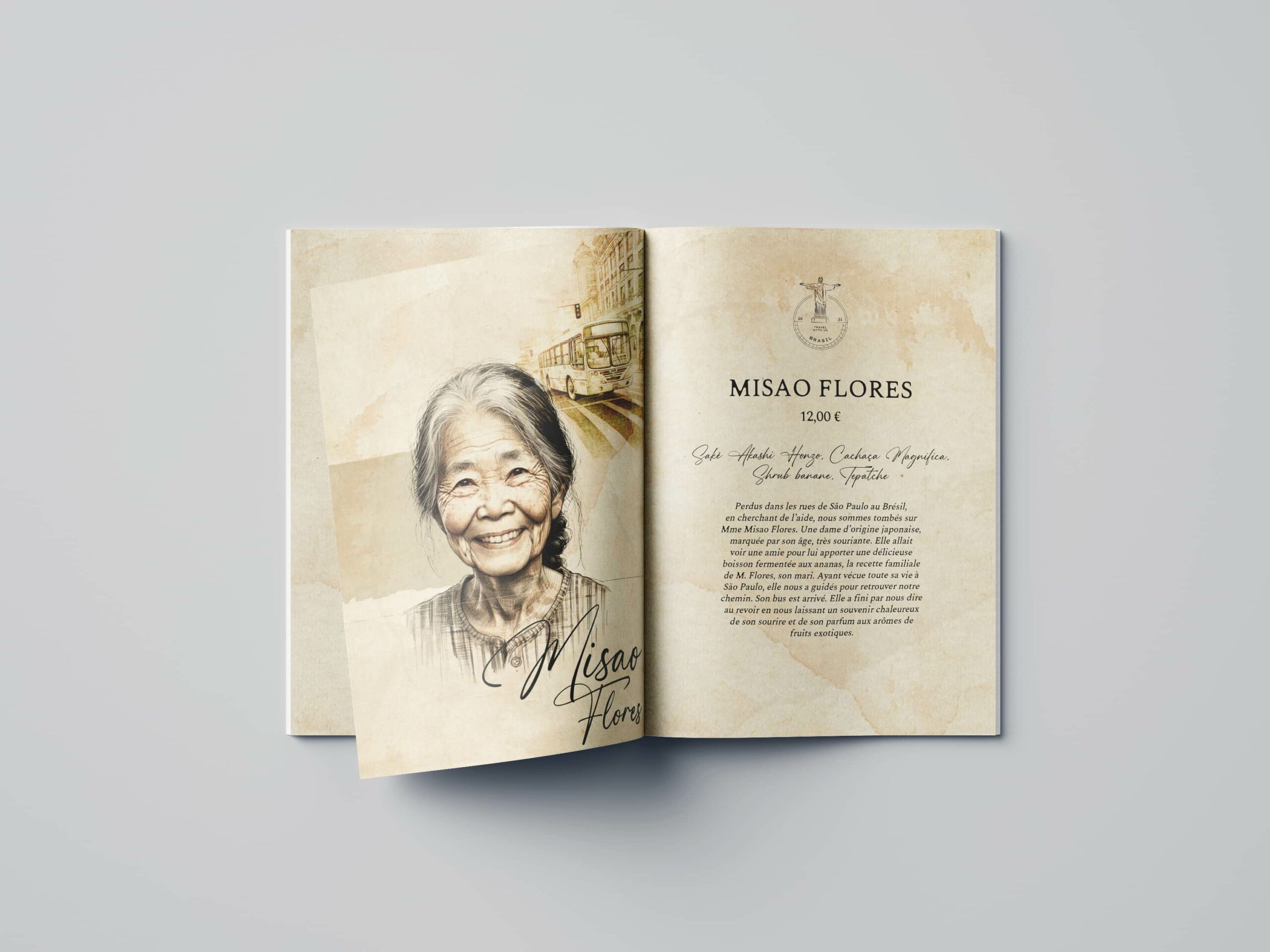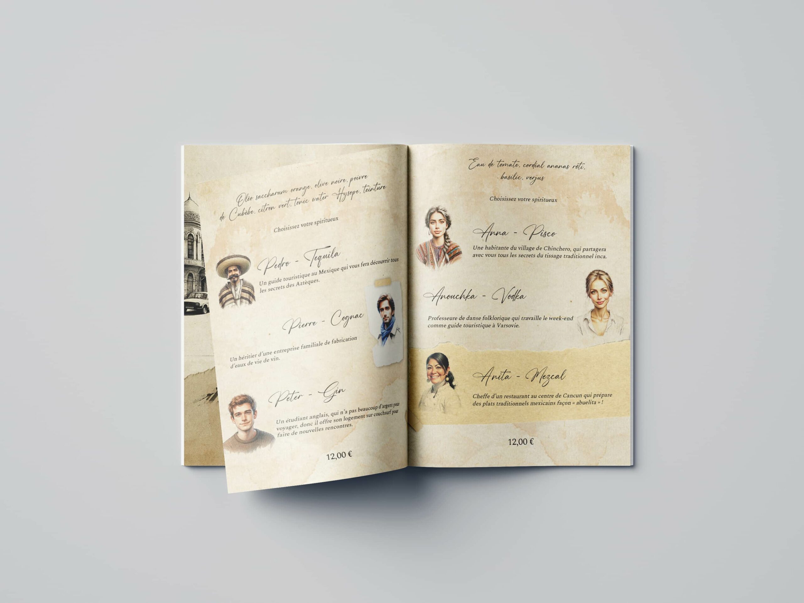 Chaque création est associée à un personnage imaginaire croisé en voyage. Un guide à Mexico, une grand-mère japonaise à São Paulo, un musicien à Calabre ou une cheffe à Lexington… Ces portraits esquissent des récits de vie, de goût et de culture, traduits en alliances liquides surprenantes.