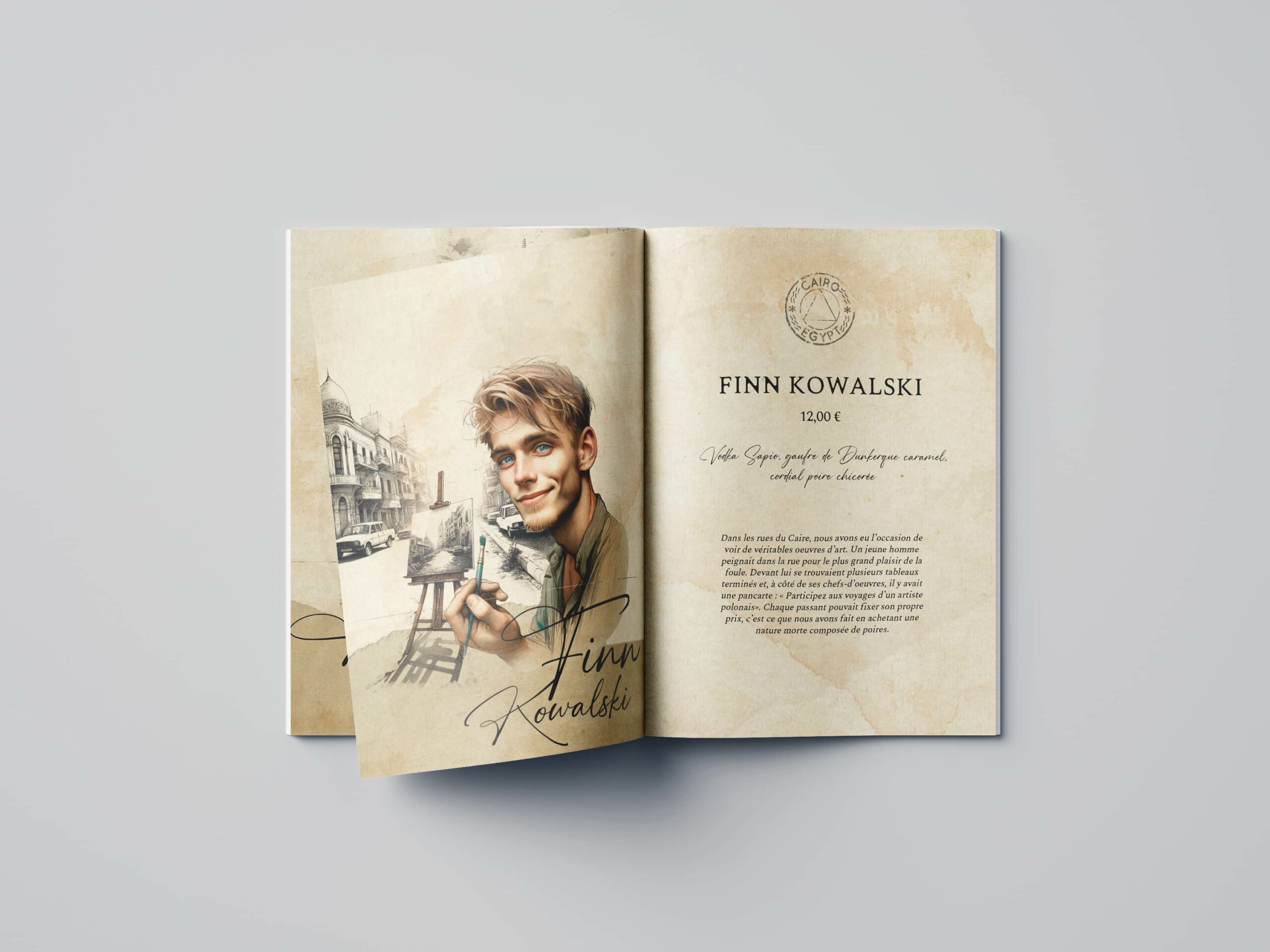 J’ai imaginé un logo en forme de globe stylisé, traversé de courbes topographiques. Ce motif organique — décliné sur l’ensemble des supports — symbolise les reliefs du monde, les cultures mêlées et les itinéraires culinaires qui s’entrelacent dans chaque plat.