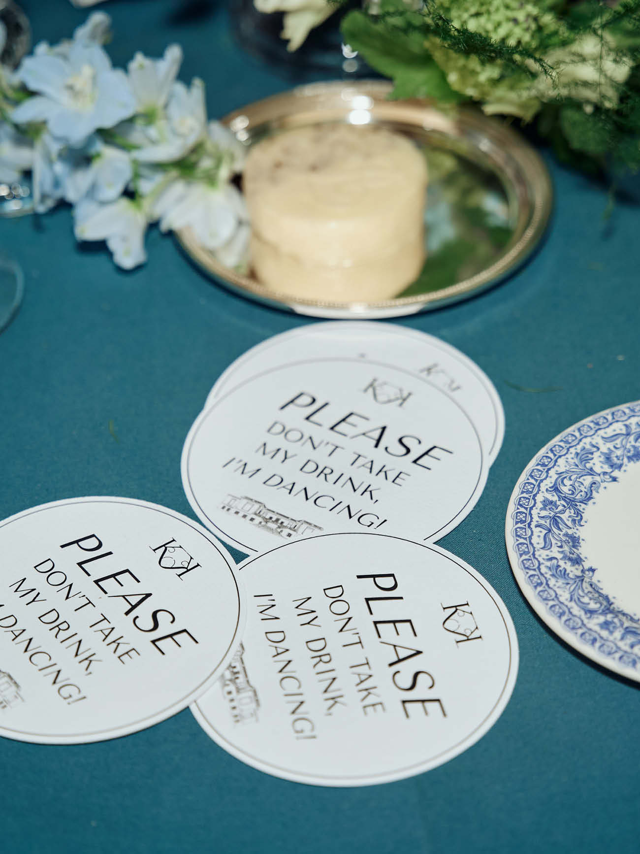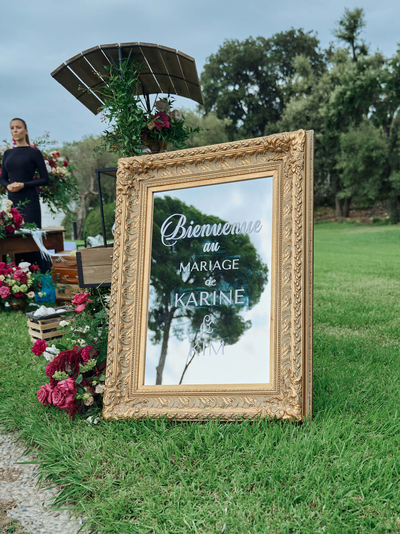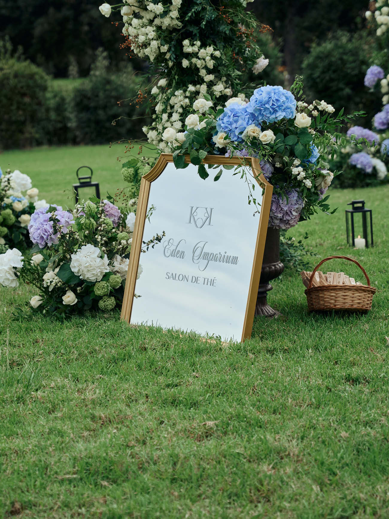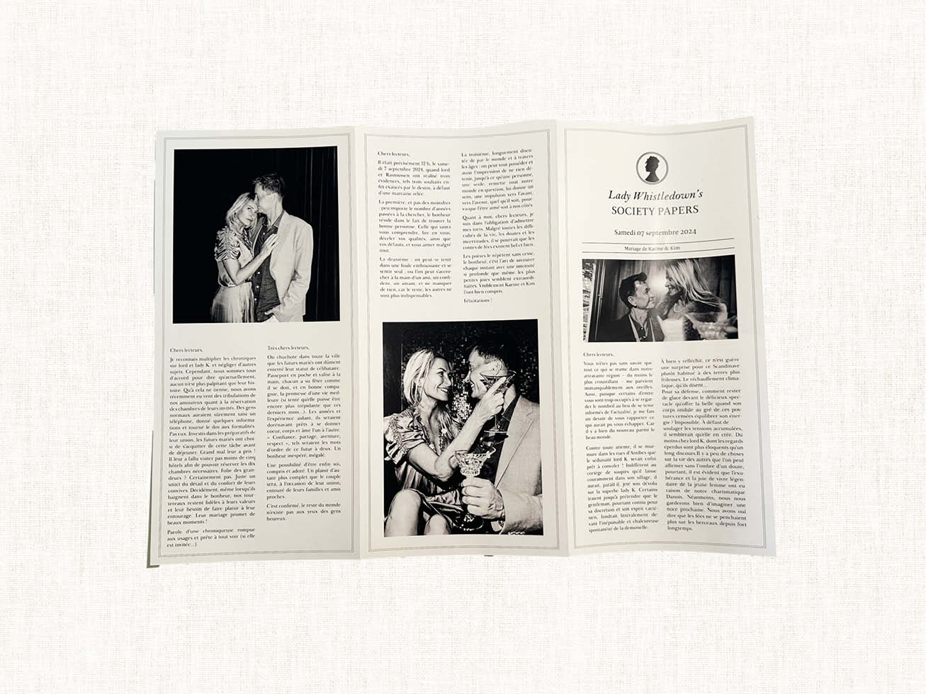 La signalétique, conçue comme un parcours à vivre et à photographier, mêlait miroirs, panneaux anciens, et vinyles adhésifs. La gazette des mariées, quant à elle, s’inspirait des chroniques de Bridgerton, pour raconter avec humour et finesse les coulisses du mariage. Enfin, chaque cadeau invité a été personnalisé et réalisé avec des artisans locaux, dans un esprit de raffinement et de gratitude.