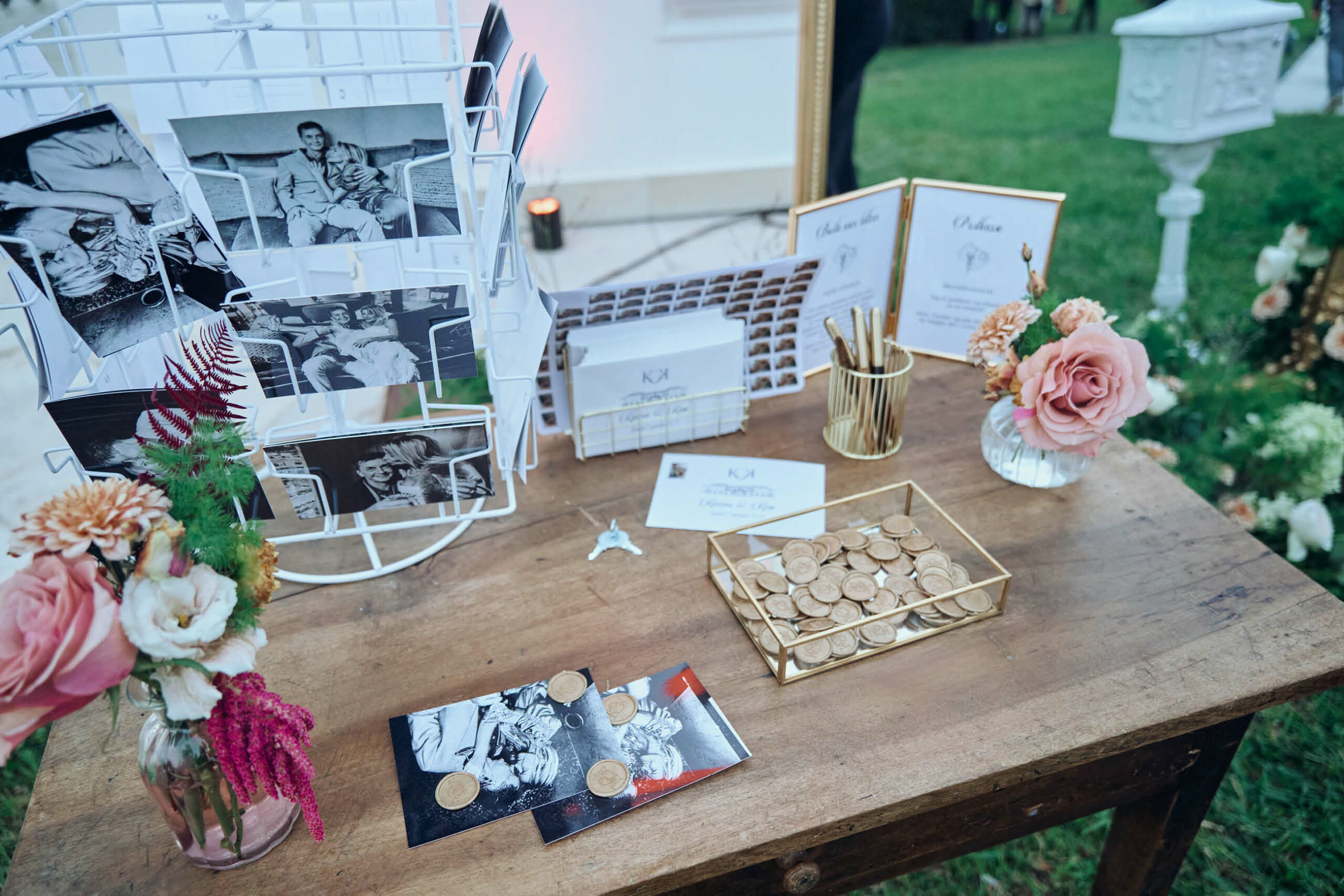 Pour le livre d’or, j’ai conçu un stand de cartes postales à écrire sur des clichés issus d’un précédent shooting des mariées, à poster dans une boîte aux lettres vintage. Un arbre à souhaits, où chacun suspendait ses vœux accompagnés d’une clé symbolique, complétait l’animation.