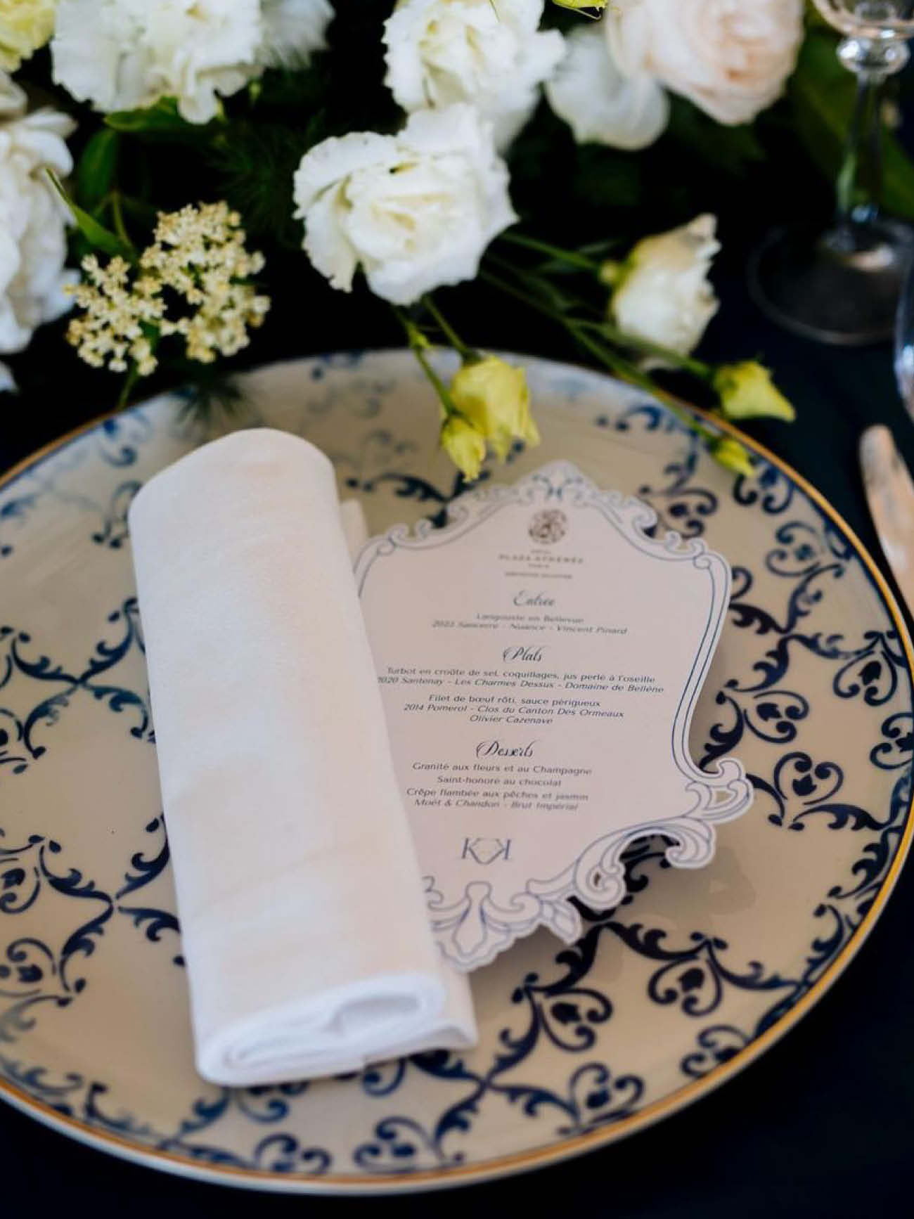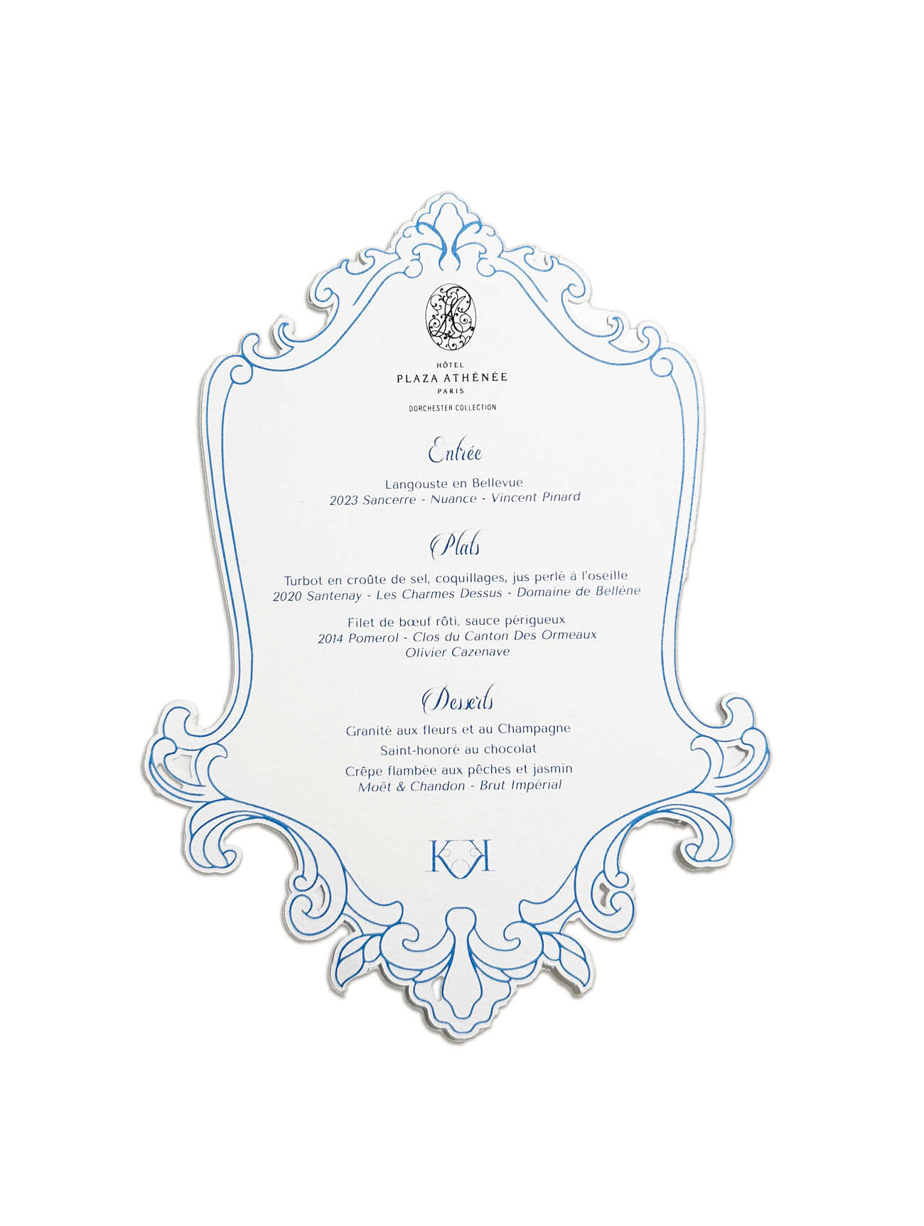 Pour rendre hommage au traiteur d’exception, j’ai imaginé un menu inspiré des codes graphiques mythiques du Plaza Athénée, dans une forme découpée ornementale, bordée de bleu pâle.