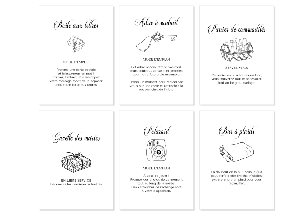 Le traditionnel panneau de bienvenue a été remplacé par une enveloppe scellée remise dès l’arrivée : programme, plan illustré, emplacements et mots des mariées. Une invitation à découvrir un monde parallèle… avec style.