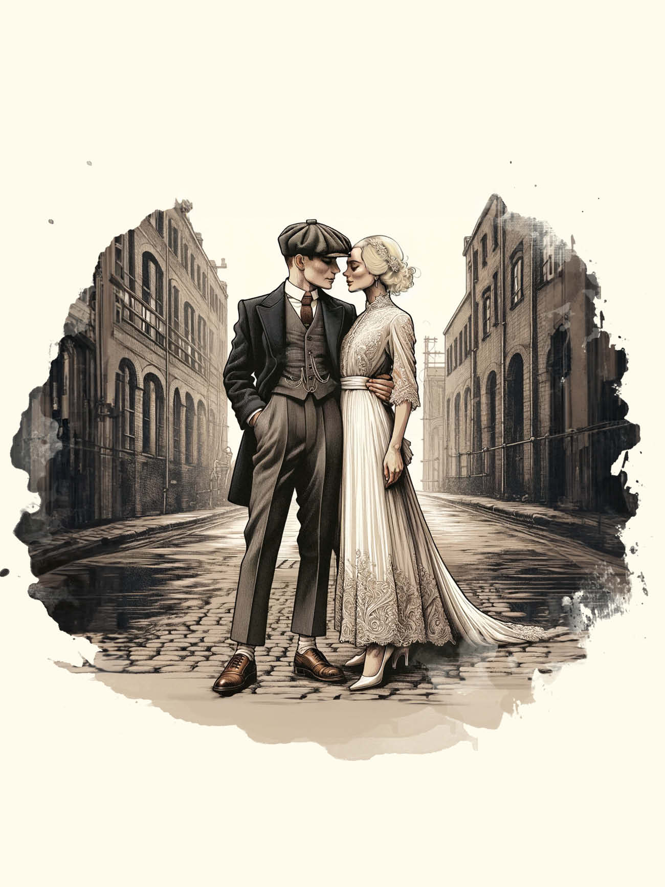 Derrière les grilles majestueuses d’une bâtisse privée à Antibes, les invités de Kim et Karine sont entrés dans un autre temps. Celui d’un mariage entièrement pensé comme un voyage immersif dans l’univers des Peaky Blinders, où chaque espace racontait une scène, chaque détail renforçait l’illusion, et chaque support imprimé devenait un objet de décor.