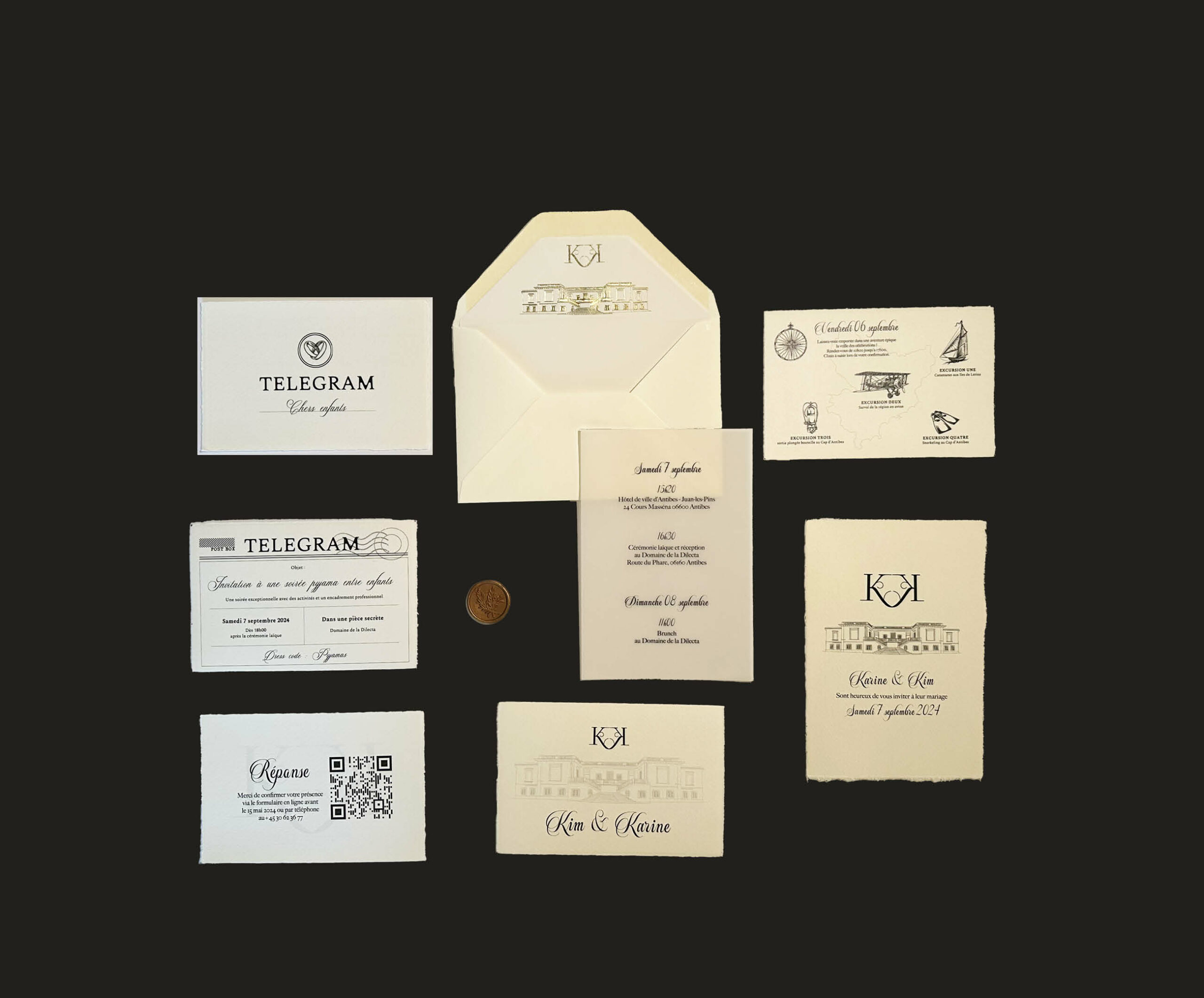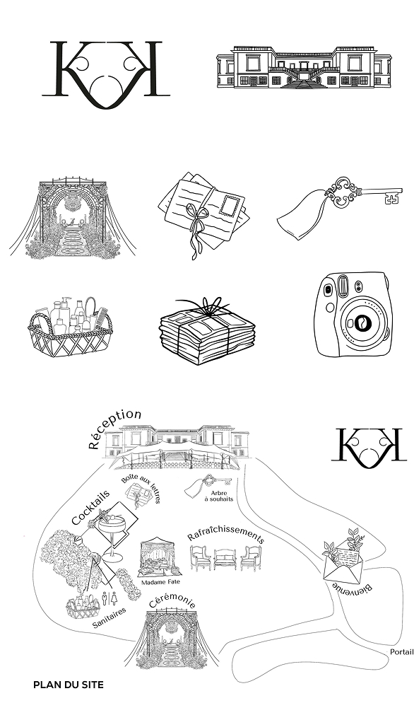 J’ai eu le plaisir de concevoir l’intégralité de l’identité visuelle, du concept scénographique et de la papeterie. Le point de départ graphique : un monogramme en miroir aux lignes Art déco, signature des mariées, et l’illustration sur mesure de la maison, devenue l’élément moteur de toute la direction artistique. Chaque concept majeur a été décliné en dessin pour enrichir l’univers visuel avec cohérence et raffinement.