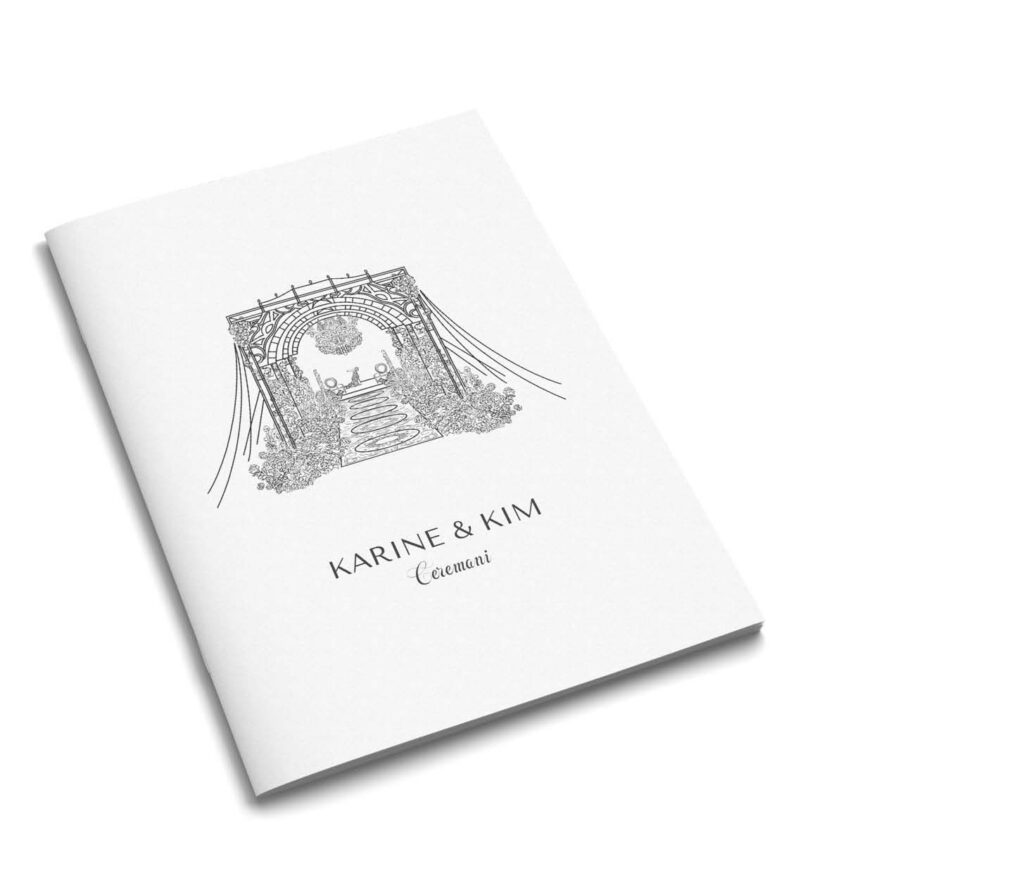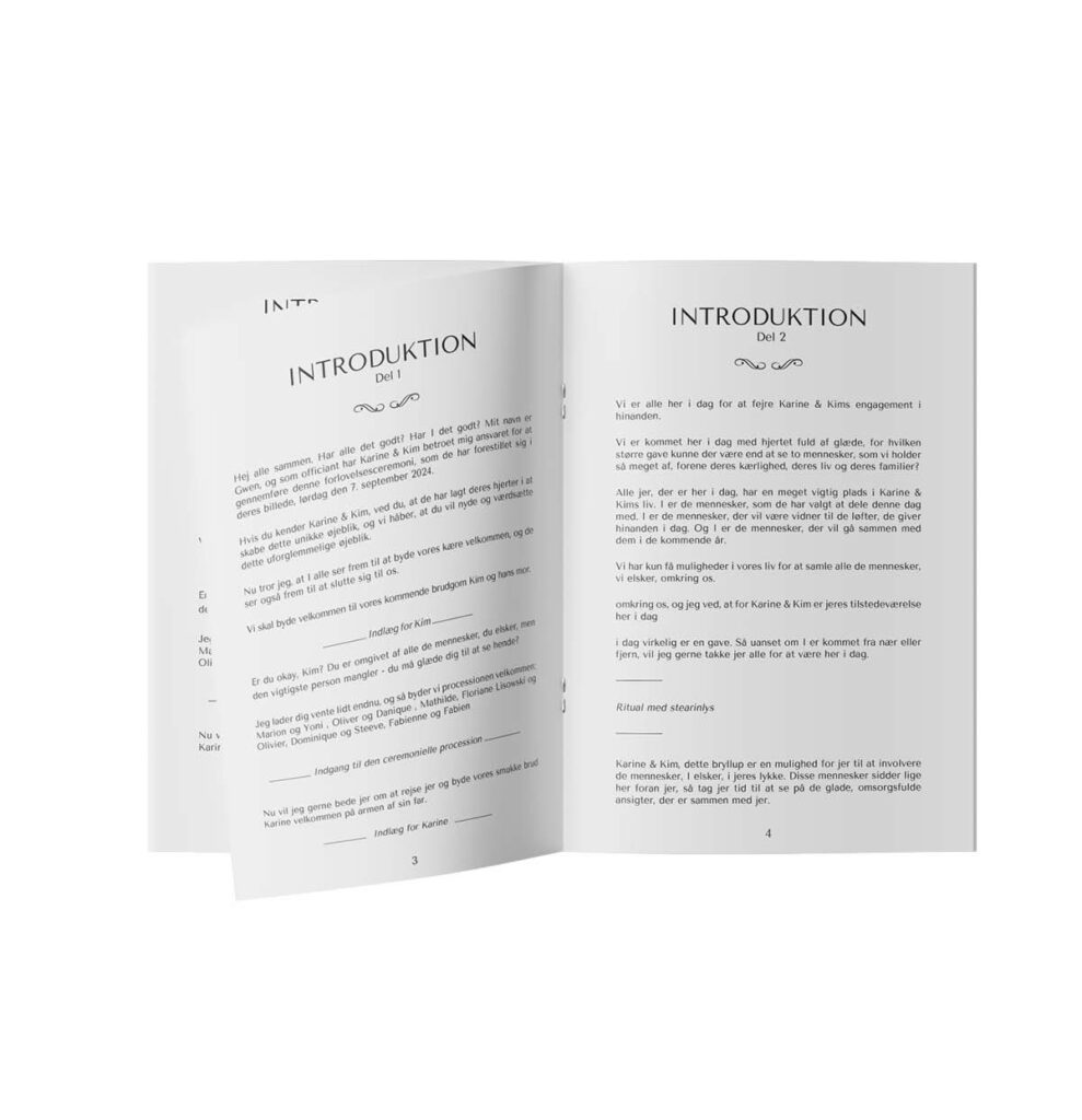Le livret de cérémonie, bilingue français-danois, a été imaginé dans un esprit minimaliste haut de gamme pour accompagner une cérémonie laïque inspirée des traditions irlandaises et roms.