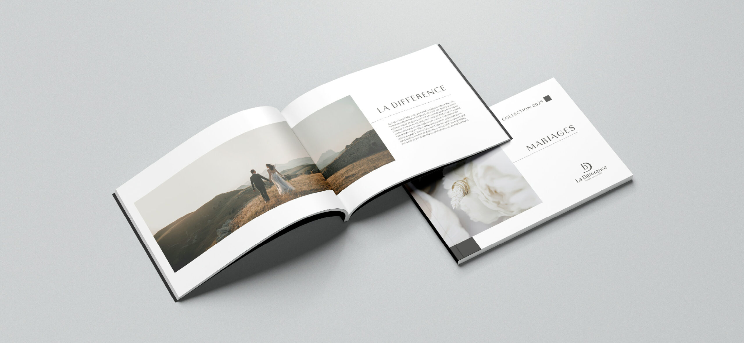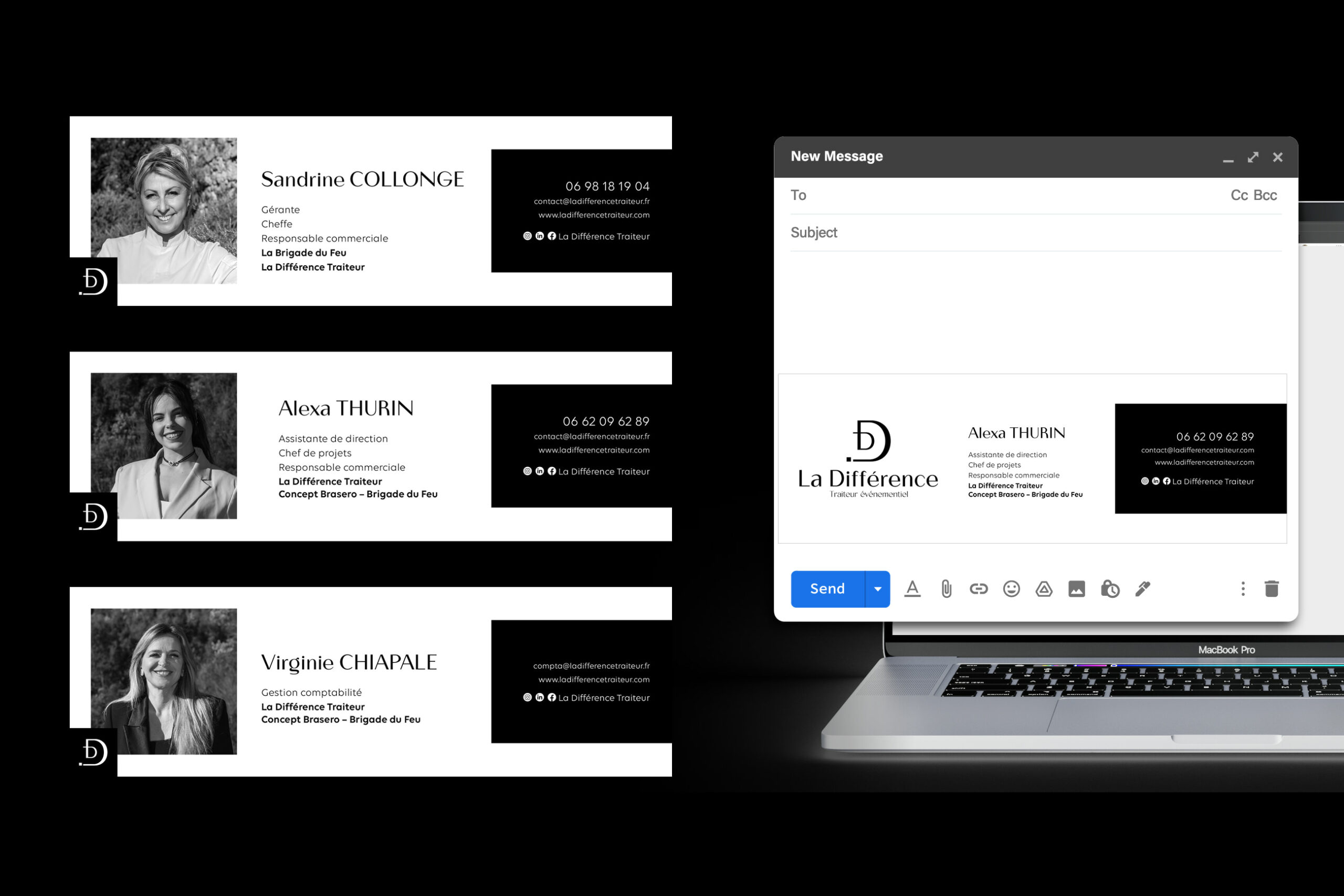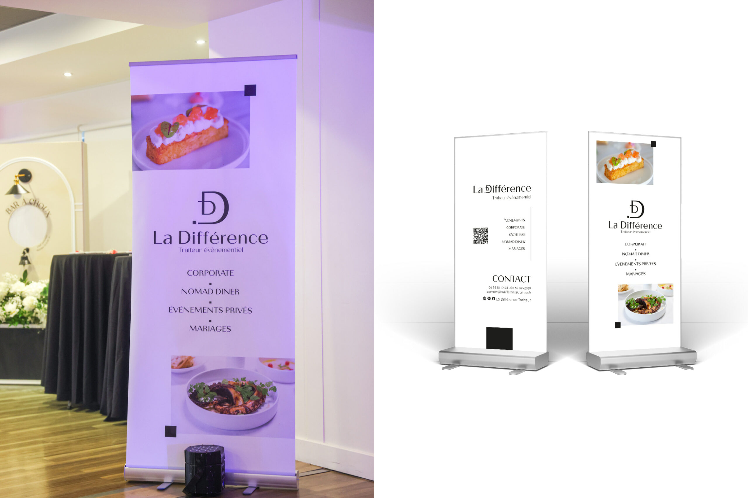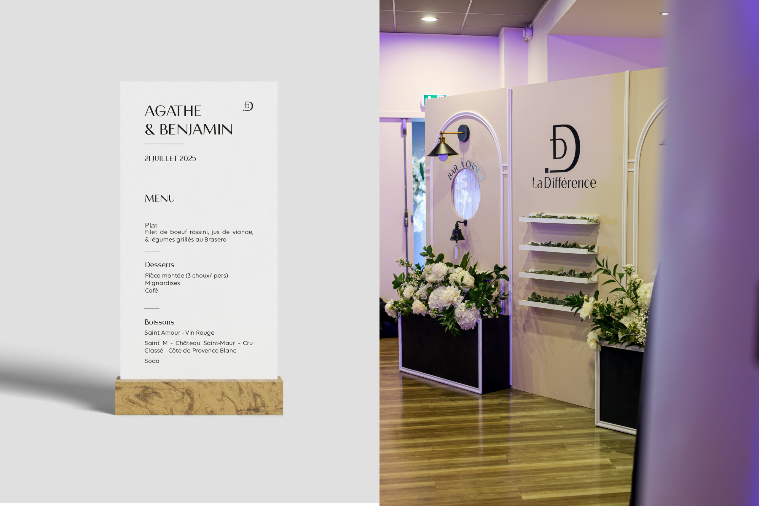 Le logo de La Différence s’appuie sur la courbe du nombre d’or pour créer un symbole intemporel et harmonieux, reflet d’un positionnement haut de gamme. Sa forme minimaliste, associée à une typographie linéale épurée, évoque modernité, rigueur et sophistication. Le contraste entre le nom et la baseline assure une hiérarchie visuelle élégante et lisible. Pensé comme un équilibre entre art et précision, ce logo incarne une gastronomie d’exception, où chaque détail est synonyme de maîtrise et de raffinement.